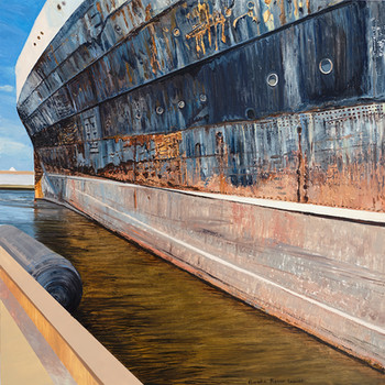 Her latest paintings chronicle rarely-seen details of the SS United States, America's Flagship, which is at risk of being evicted from its berth in South Philadelphia. She also has new paintings of the rudder of the Tallship Gazela, as well as other scenes.